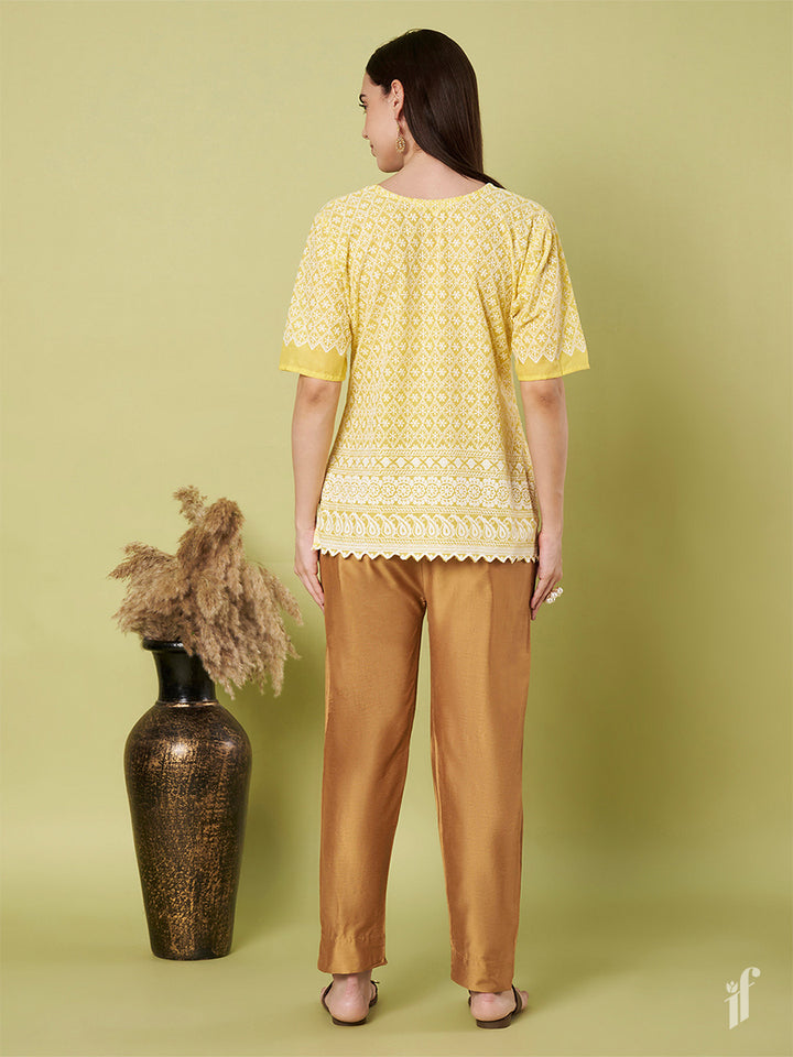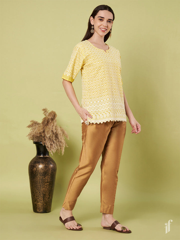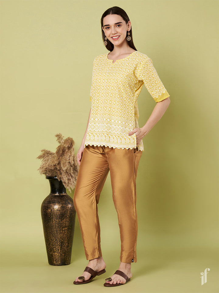 Shine in style with the Golden Metallic Pants, perfect for elevating both ethnic and Western looks in seconds. Made from polyester & viscose, these pants offer a comfortable elasticized waistband, a sleek slant pocket, a stylish tapered fit, and a slit at the hem a dazzling addition to your wardrobe!