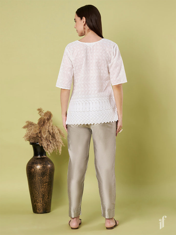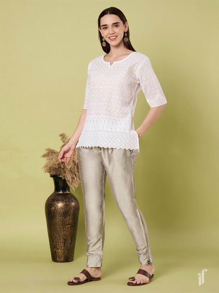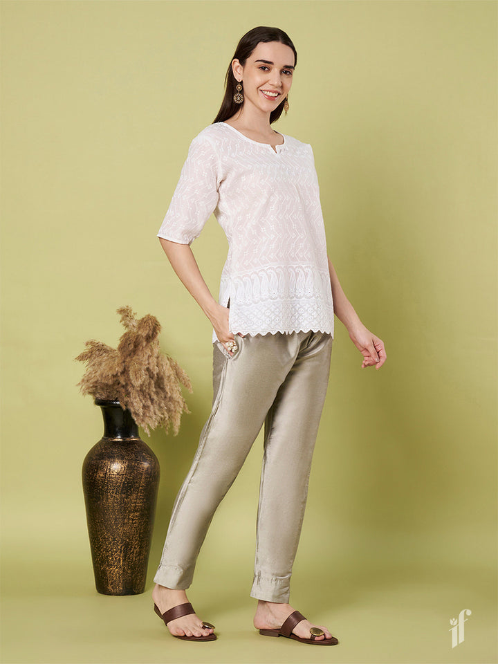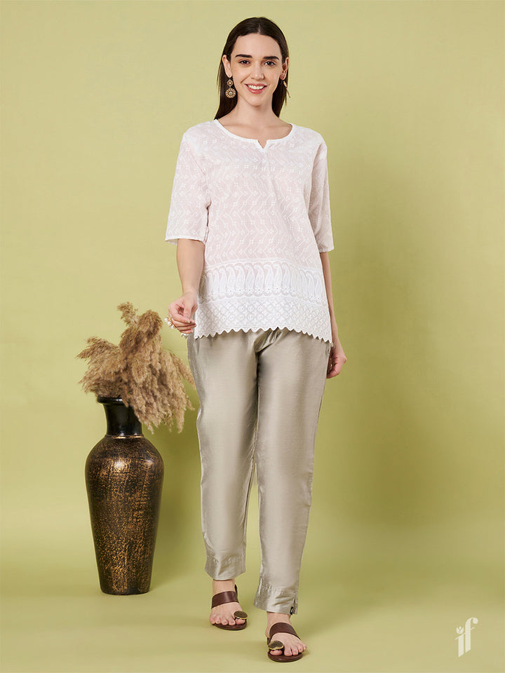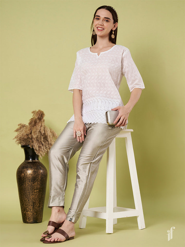 Shimmer in style with the Silver Metallic Pants, crafted to add a touch of glam to any look. Made from polyester & viscose, these pants feature a sleek tapered fit, a comfy elasticized waistband, functional slant pockets, and a trendy slit at the hem—perfect for effortless elegance with every step!