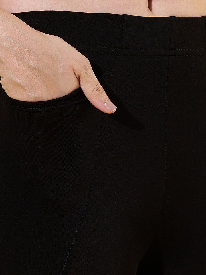 Experience comfort and style with these Black Cotton 7/8 Leggings, designed for a sleek, sophisticated look. Crafted from soft cotton, they offer breathability and ease of movement. The practical pocket adds functionality without compromising elegance, making these leggings perfect for both casual outings and refined everyday wear.